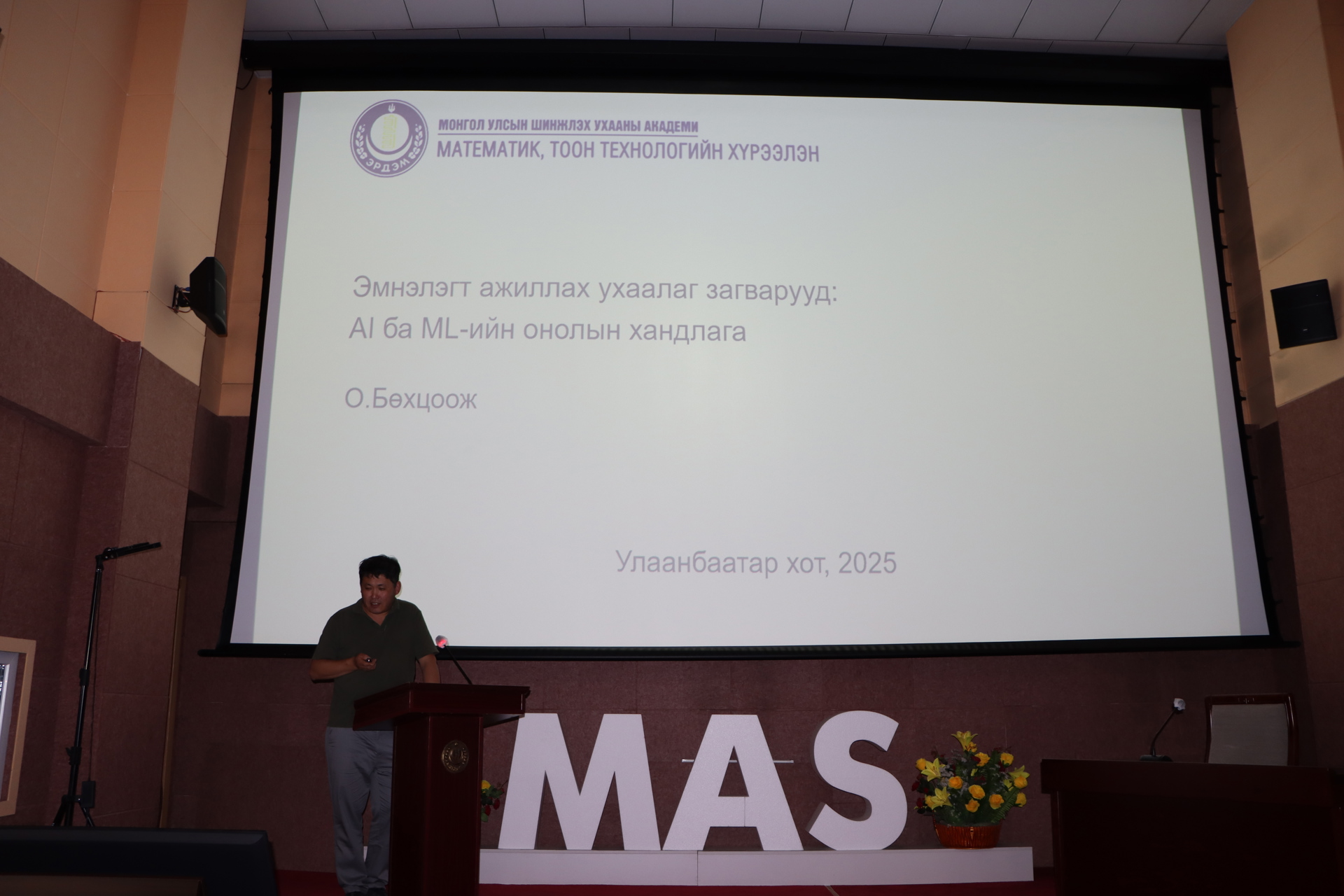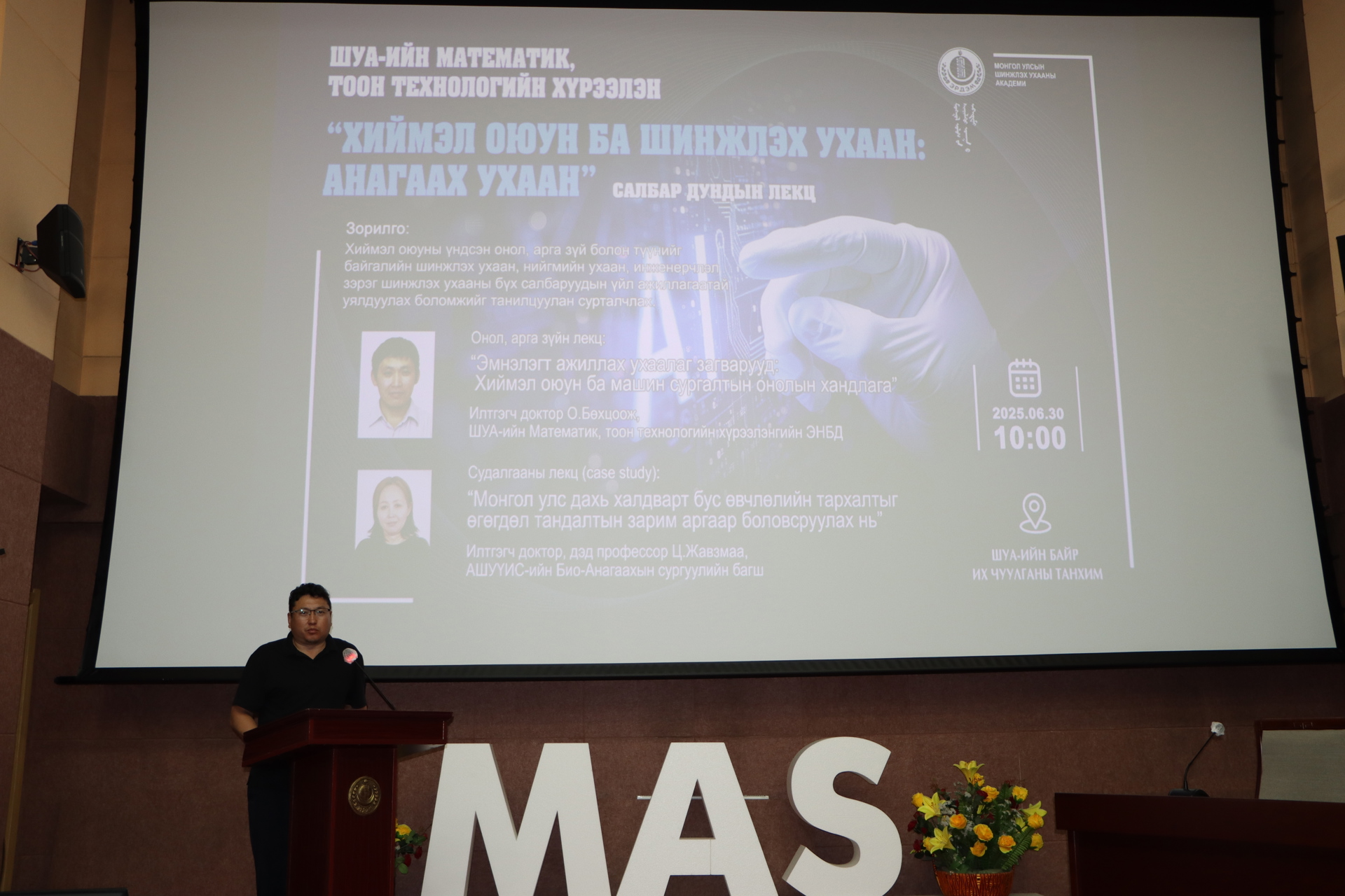 Математик, тоон технологийн хүрээлэнгээс санаачлан Хиймэл оюуны үндсэн онол, арга зүй болон түүнийг байгалийн шинжлэх ухаан, нийгмийн ухаан, инженерчлэл зэрэг шинжлэх ухааны бүх салбаруудын үйл ажиллагаатай уялдуулах боломжийг танилцуулан сурталчлах зорилготой зохион байгуулж буй "ХИЙМЭЛ ОЮУН БА ШУ" салбар дундын цуврал лекц энэ удаа Анагаах ухааны салбараар өнөөдөр буюу 2025 оны 6 сарын 30-ны өдөр амжилттай зохион байгуулагдлаа.