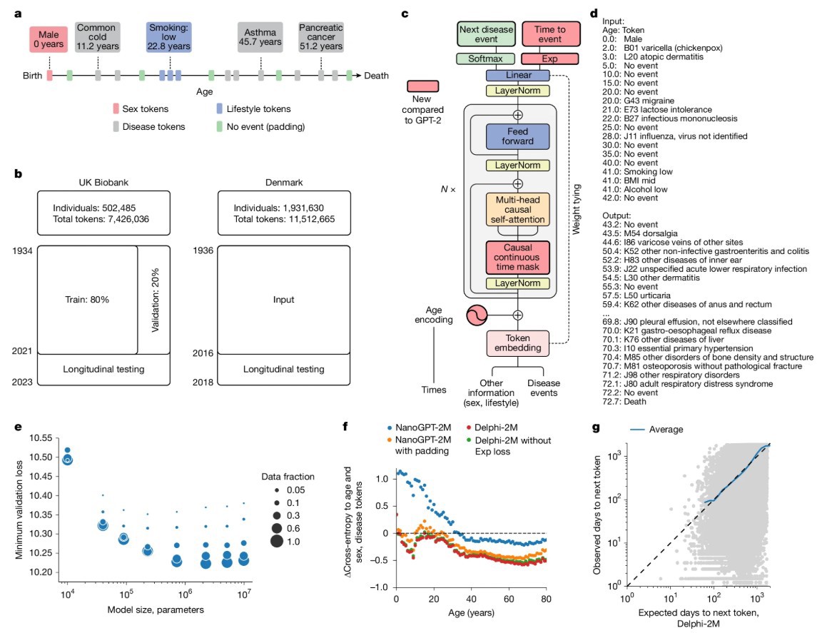 Зураг 2. Delphi — GPT архитектурын өөрчлөгдсөн хувилбар бөгөөд эрүүл мэндийн траекторыг загварчилдаг. ( a. ICD-10 онош, амьдралын хэв маяг болон “health padding” токен дээр суурилсан эрүүл мэндийн траекторыг үзүүлсэн схем. Эдгээр мэдээллийг тус бүр өөр өөр насанд бүртгэсэн байдаг. b. Сургалт, баталгаажуулалт болон туршилтын өгөгдөл: UK Biobank (зүүн талд) болон Данийн өвчний бүртгэл (баруун талд). c. Delphi загварын архитектур. Улаанаар тэмдэглэсэн хэсгүүд нь үндсэн GPT-2 загвартай харьцуулахад хийгдсэн өөрчлөлтийг харуулна. “N ×” нь трансформер блокийг дарааллаар нь N удаа хэрэглэхийг илэрхийлнэ. d. Загварт өгсөн оролт (prompt) ба гарсан үр дүнгийн (samples) жишээ. Эдгээр нь (нас:токен) хосуудаас бүрдэнэ. e. Delphi-ийн масштабын хууль. Янз бүрийн сургалтын өгөгдлийн хэмжээнд загварын параметрийн тоо хэрхэн нэмэгдэхэд баталгаажуулалтын алдааны хамгийн бага утга өөрчлөгдөж байгааг харуулсан. f. Ablation шинжилгээний үр дүн. Нас ба хүйсэд суурилсан суурь загвартай харьцуулсан cross-entropy-ийн зөрүү (y тэнхлэг)-г насны ангиллаар (x тэнхлэг) харуулсан. g. Үйл явдал болох хүртэлх хугацааны таамаглалын нарийвчлал. Дараагийн токен бүрийн бодитоор ажиглагдсан (y тэнхлэг) болон хүлээгдсэн (x тэнхлэг) хугацааг цэгүүдээр (саарал) харуулсан. Цэнхэр шугам нь x тэнхлэгийн дараалсан интервал бүрийн дундажийг илэрхийлнэ. )